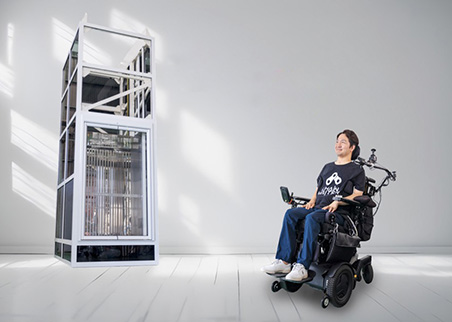 車いす対応段差解消機「チェーンウェイター」は、当社製のジップチェーンを使用することにより最大4mの段差の移動を実現。独立耐震構造フレームにより、既存の建物にも短納期かつ低費用で設置できることが特長です。