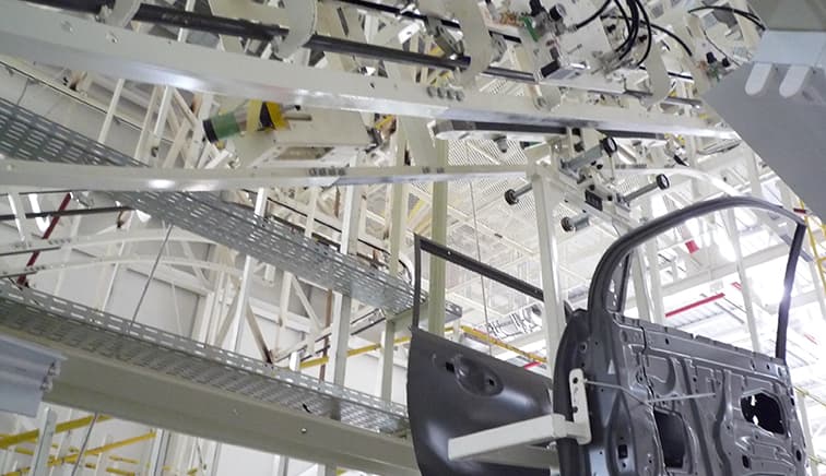 | 搬送ワーク例 | ・ドア組立前の状態 組立品 ・車のサイドパネルASS'Y ・インナーASS'Y ・ルーフ ・アンダーボディのフロントコンプ(1) ・アンダーボディのフロントフロアー(2) ・アンダーボディのリアフロアー(3) ・上記 (1)(2)(3)を一体ものにしたフロアーコンプ(アンダーボディ) |
