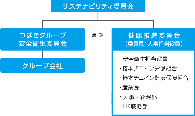 つばきグループは、「動かす」ことに進化をもたらし、社会の期待を超えていくことを社会的使命としており、その実現には、従業員の心身の健康、活力あふれる職場という基盤づくりが最重要と考えます。